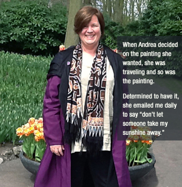 ““Summoning Sunshine” cuts through the city’s long shadows and fills my living room with energy and the color of creation. I had longed for one of Marjorie’s paintings for years. When I saw this one, I knew immediately that it was coming home with me.”